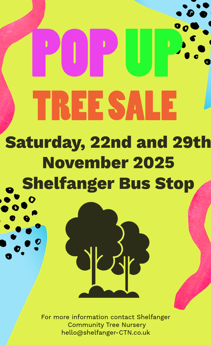 Our next pop-up tree tree sale will take place on Saturday 22nd and 29th November 2025, from 10am to 12noon in the centre of Shelfanger (next to the bus stop). We look forward to meeting you there.